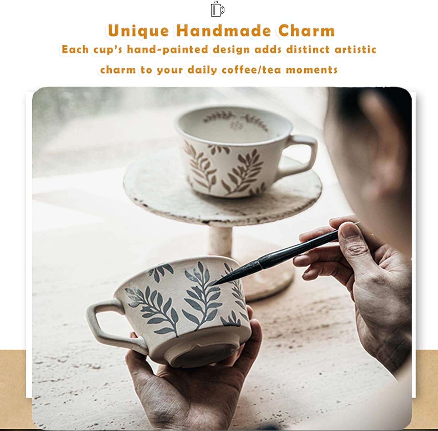 Handmade Ceramic Coffee Mug with Vintage Botanical Leaf Pattern – 11oz Large Capacity, Microwave & Dishwasher Safe