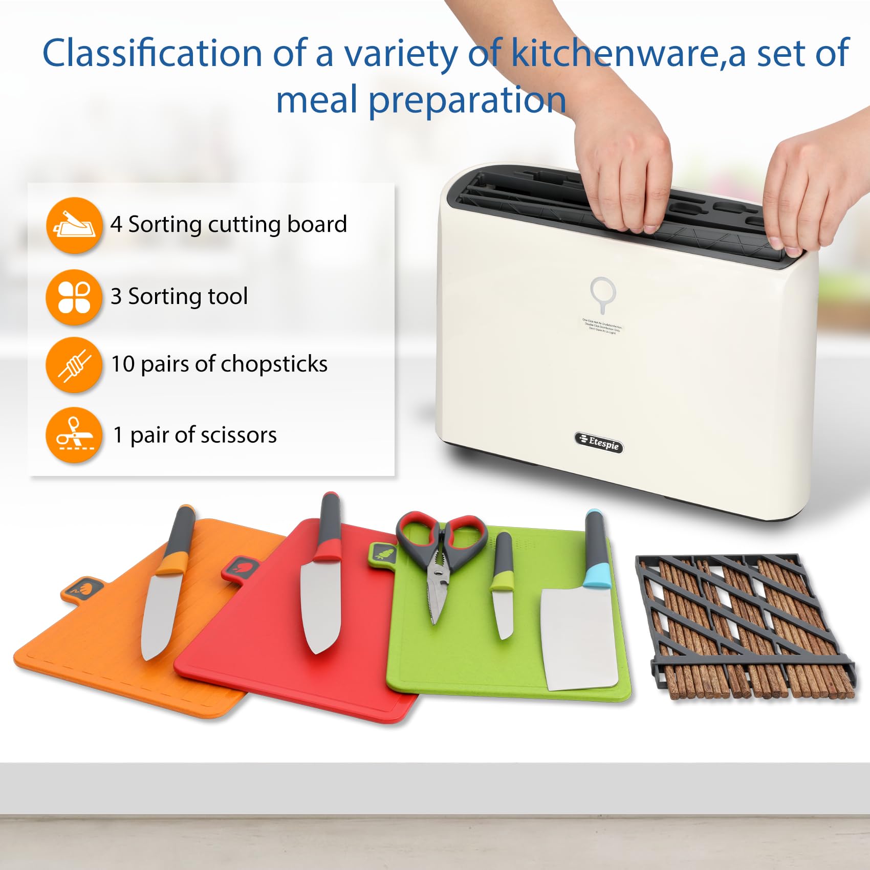 3 color-coded boards + 4 knives + 10 chopsticks + scissors + smart holder. Everything you need for organized, hygienic cooking.