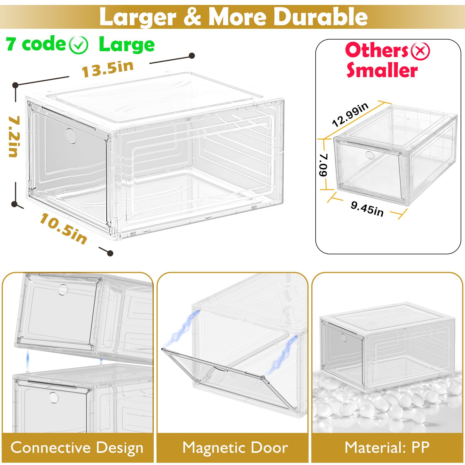 The transparent magnetic front door and stackable design make it more robust, with multi-layered support walls for increased shoe capacity. Non-slip, safe and stable. Hooks on the sides and top allow for easy stacking; connect them as needed.